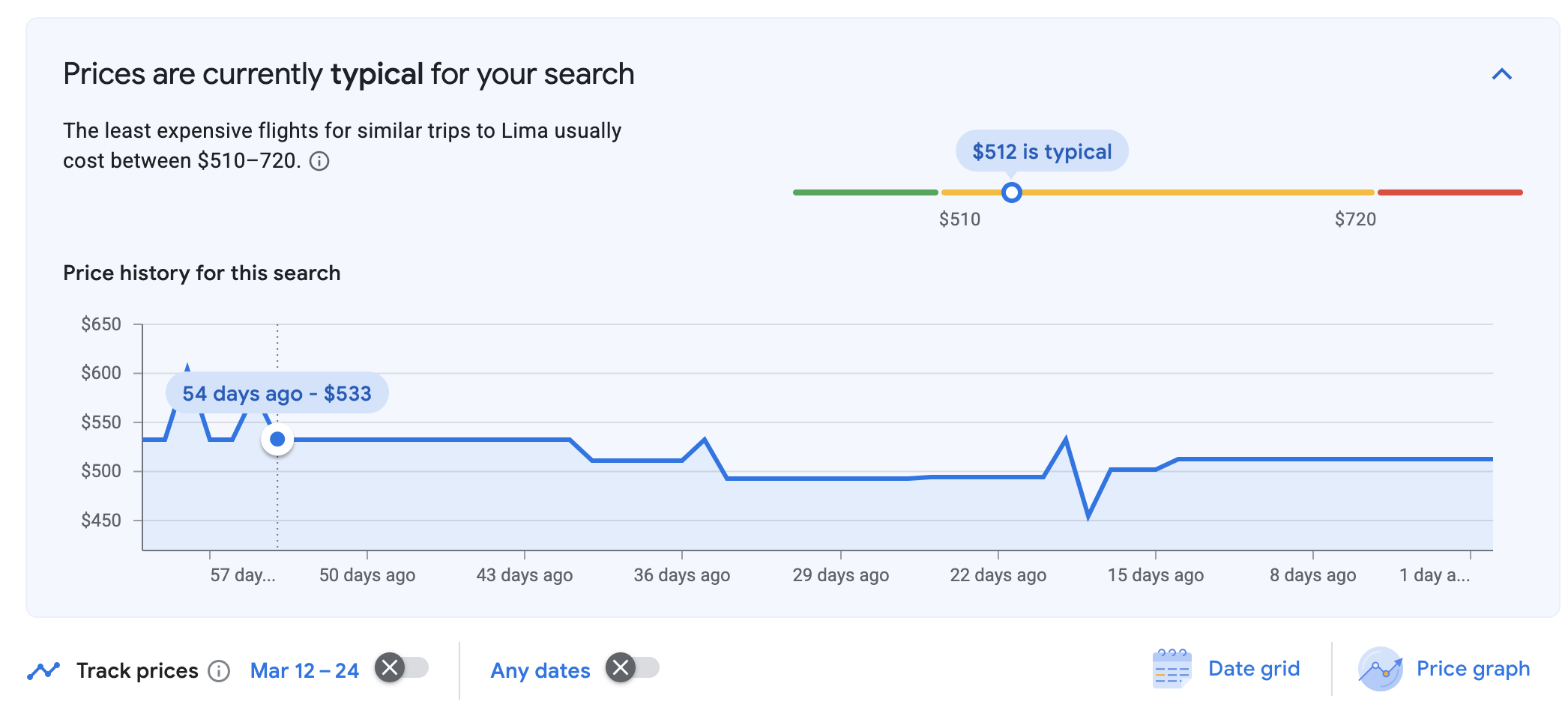 In the example above, Google Flights shows that flights to Lima typically fall within a certain price range. You can immediately see where the current price sits compared to what’s normal, instead of relying on gut feeling alone.